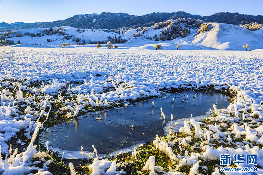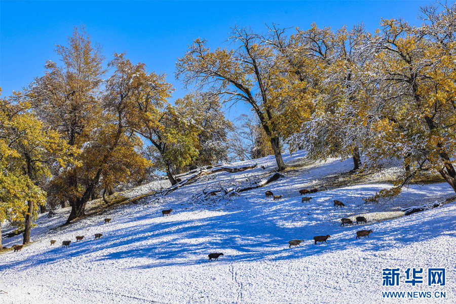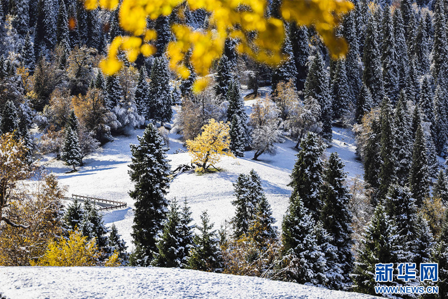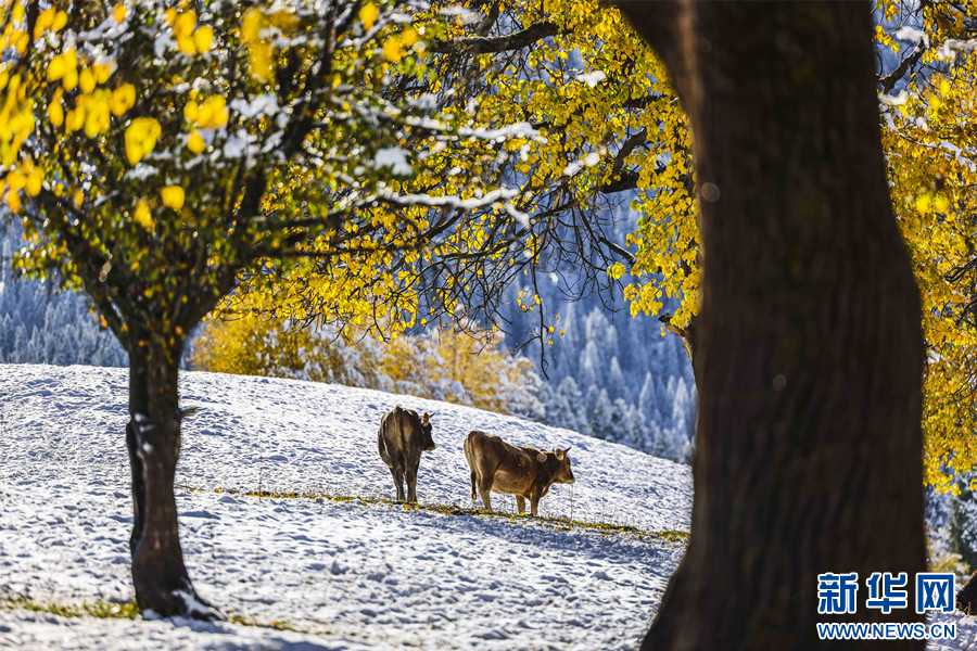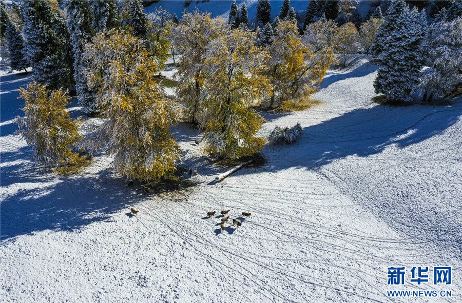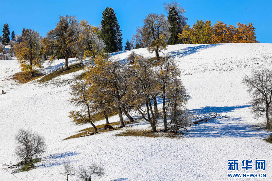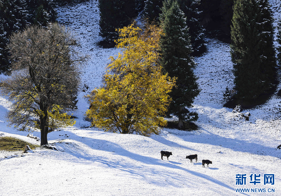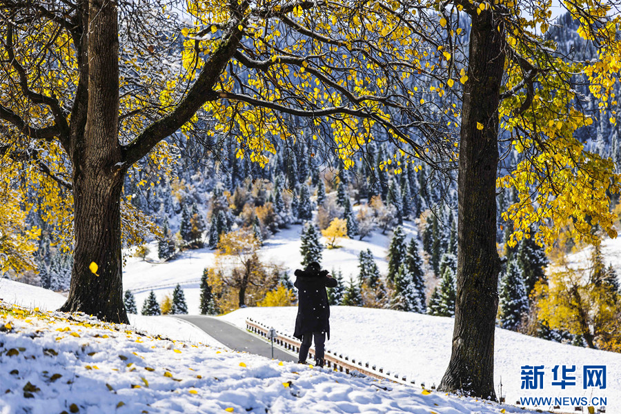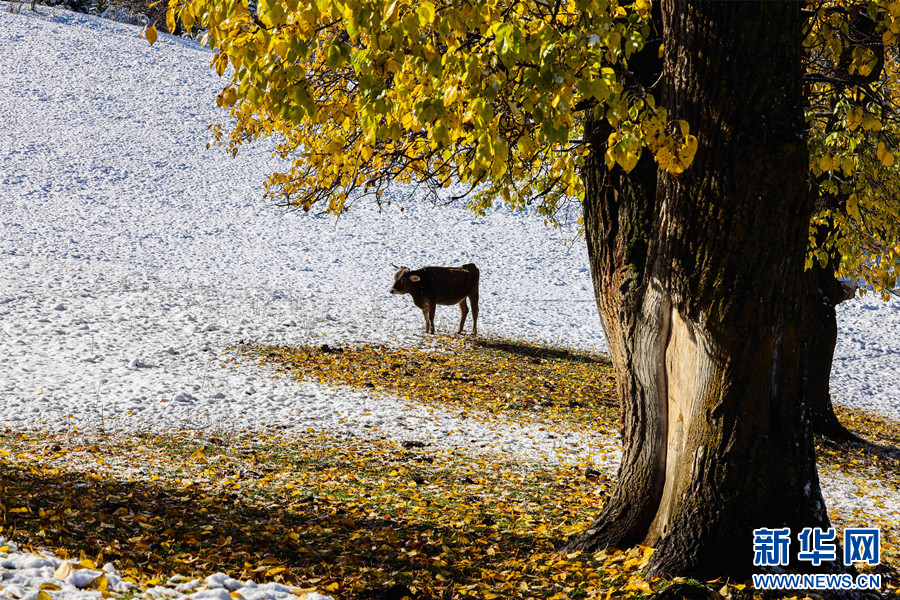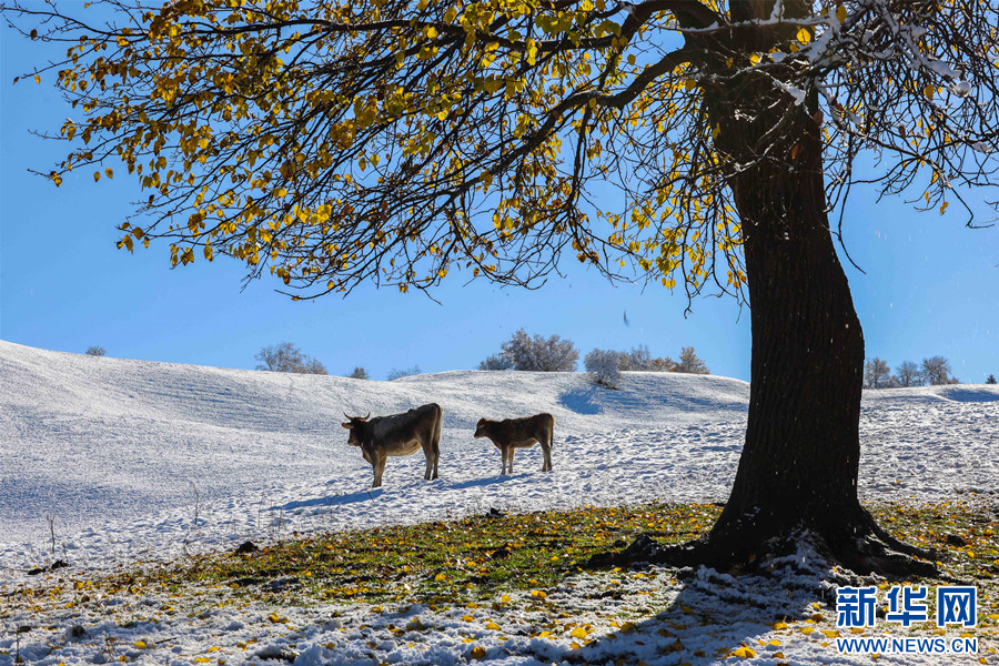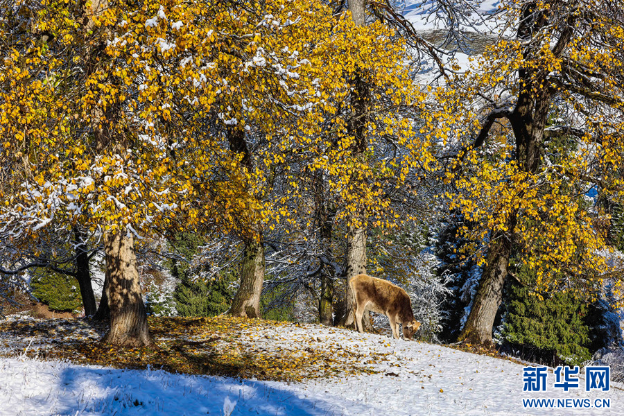 金秋与飞雪共舞,独属于秋日的壮丽奇观就此拉开序幕。近日,一场秋雪与那拉提大草原上的五彩金秋相遇。白雪倾覆那拉提大草原,仿佛为这个美丽的草原披上了一层洁白的轻纱。