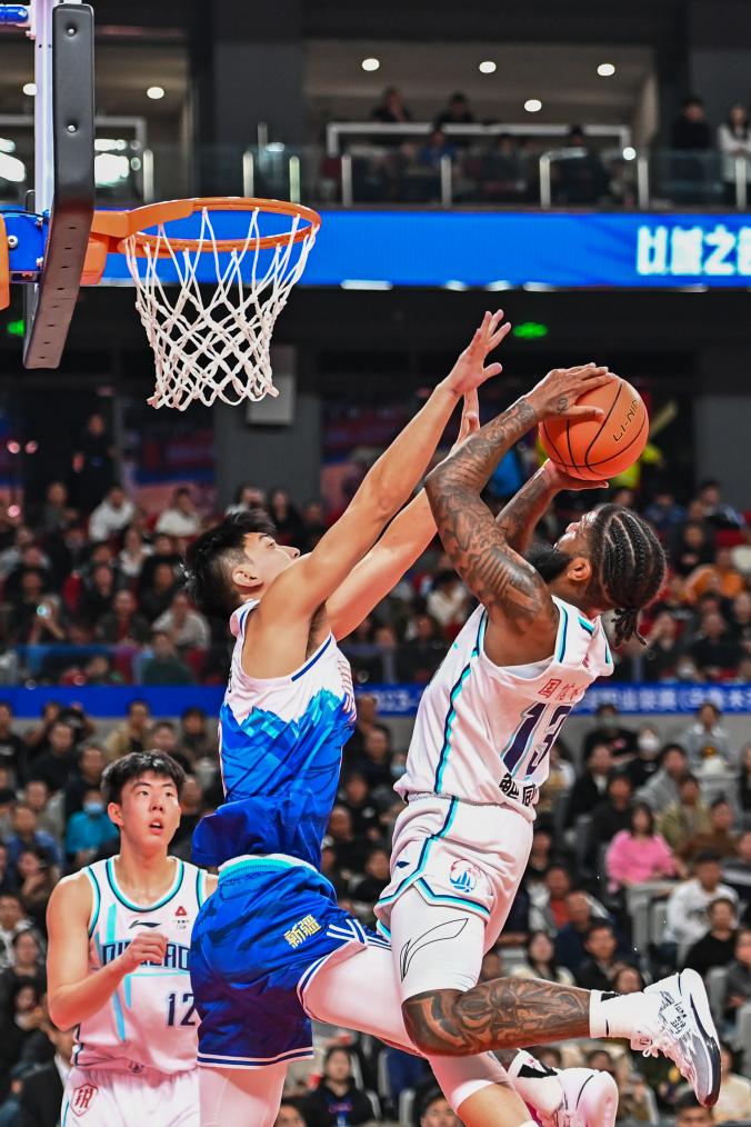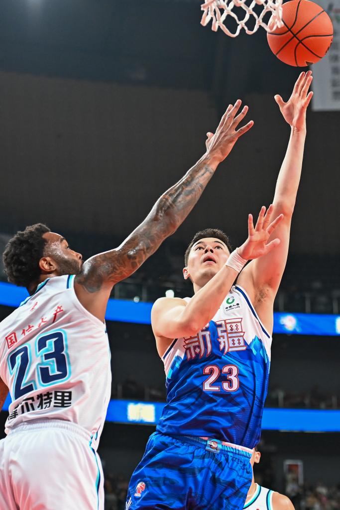 10月31日,新疆伊力特队球员齐麟(右)在比赛中进攻。
