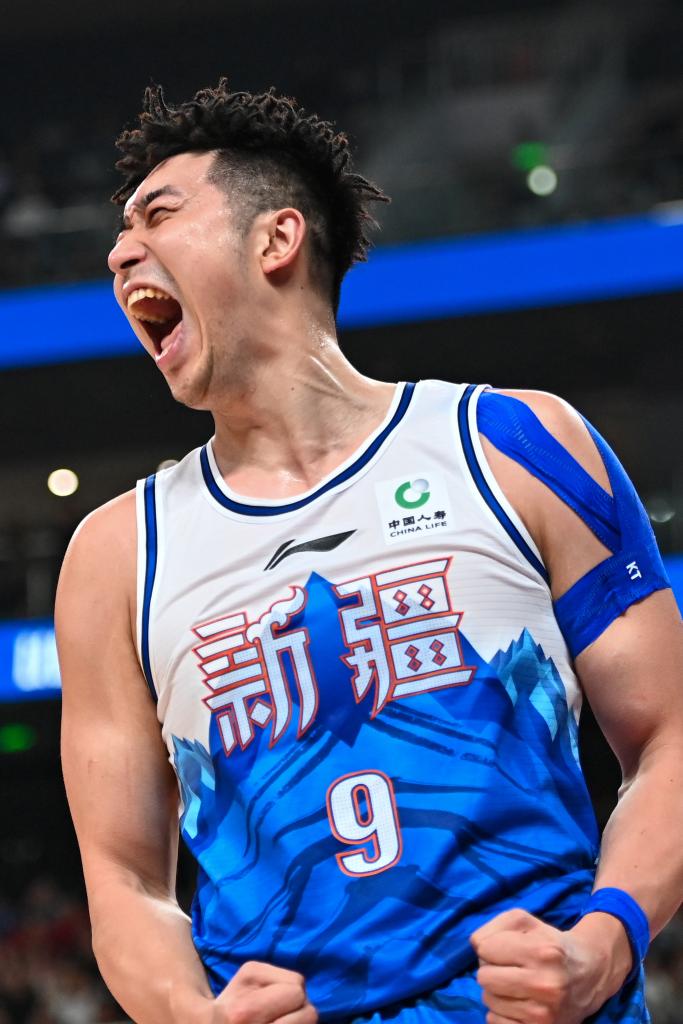 10月31日,新疆伊力特队球员吴冠希得分后庆祝。