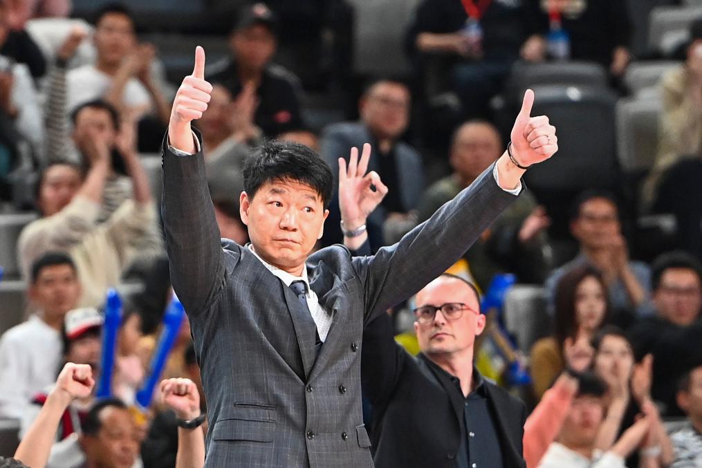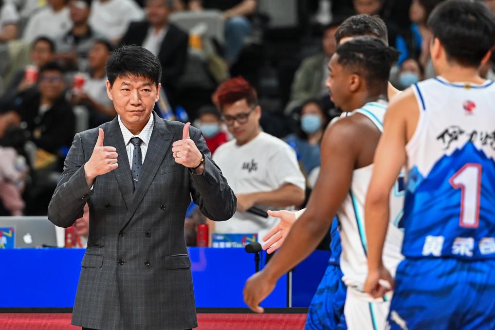 10月31日,新疆伊力特队主教练邱彪在比赛中鼓励队员。