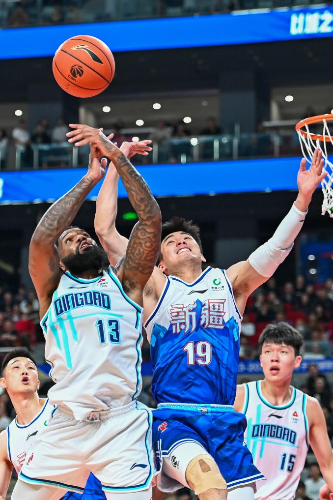 10月31日,新疆伊力特队球员于德豪(右)与青岛国信水产队球员鲍威尔拼抢篮板球。