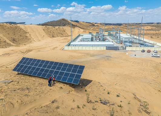 国网乌鲁木齐供电公司工作人员在米东区北沙窝光伏基地建设现场检查用电安全,保障清洁能源项目推进。王晋魁 摄