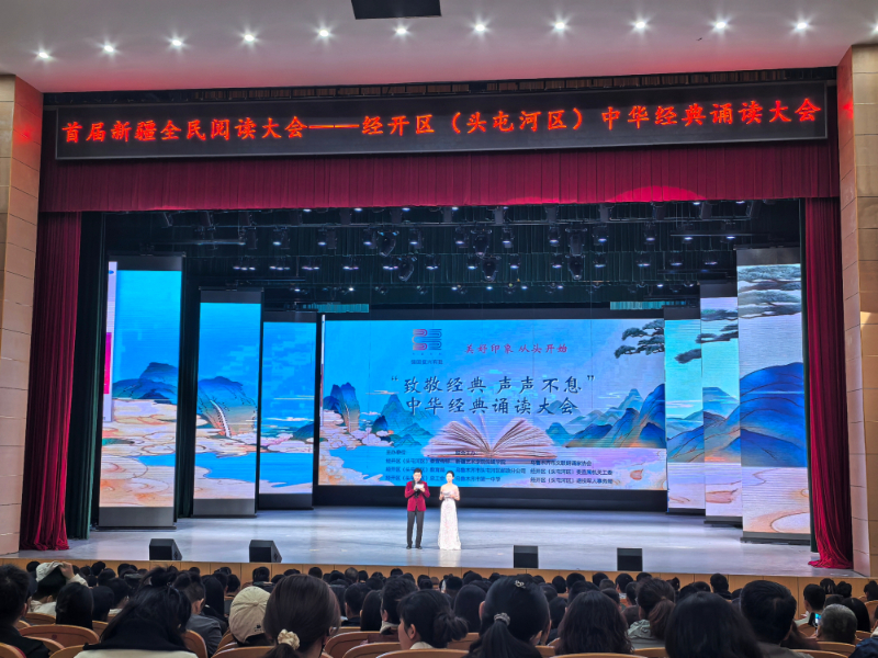 9月14日,首届新疆全民阅读大会乌鲁木齐经济技术开发区(头屯河区)“致敬经典声声不息”中华经典诵读分会场活动在乌鲁木齐市第一中学大礼堂举行,通过诗歌朗诵和文艺演出活动,为在场观众打开一扇阅读之窗。