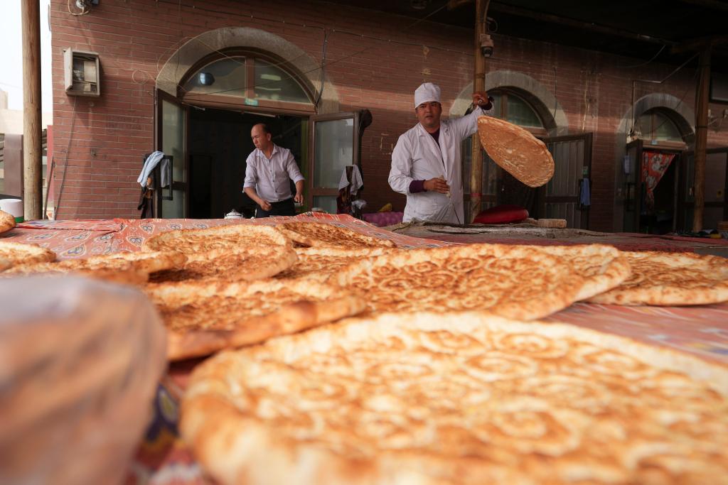 9月19日,达西村村民肉则·赛麦提(右)在文旅商业街上制作馕。近年来,达西村打造文旅商业街,吸引村民入驻,为村民增收。现在的达西村