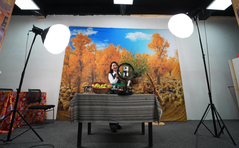 9月19日,尉犁县电商协会负责人米日阿依·阿西木在达西村的电商基地直播推介达西村农产品。近年来,达西村构建“农户生产+企业加工包装+电商销售+物流配送”全产业链,为县域经济发展培养孵化本土直播电商人才,促进传统产业转型升级。2024年