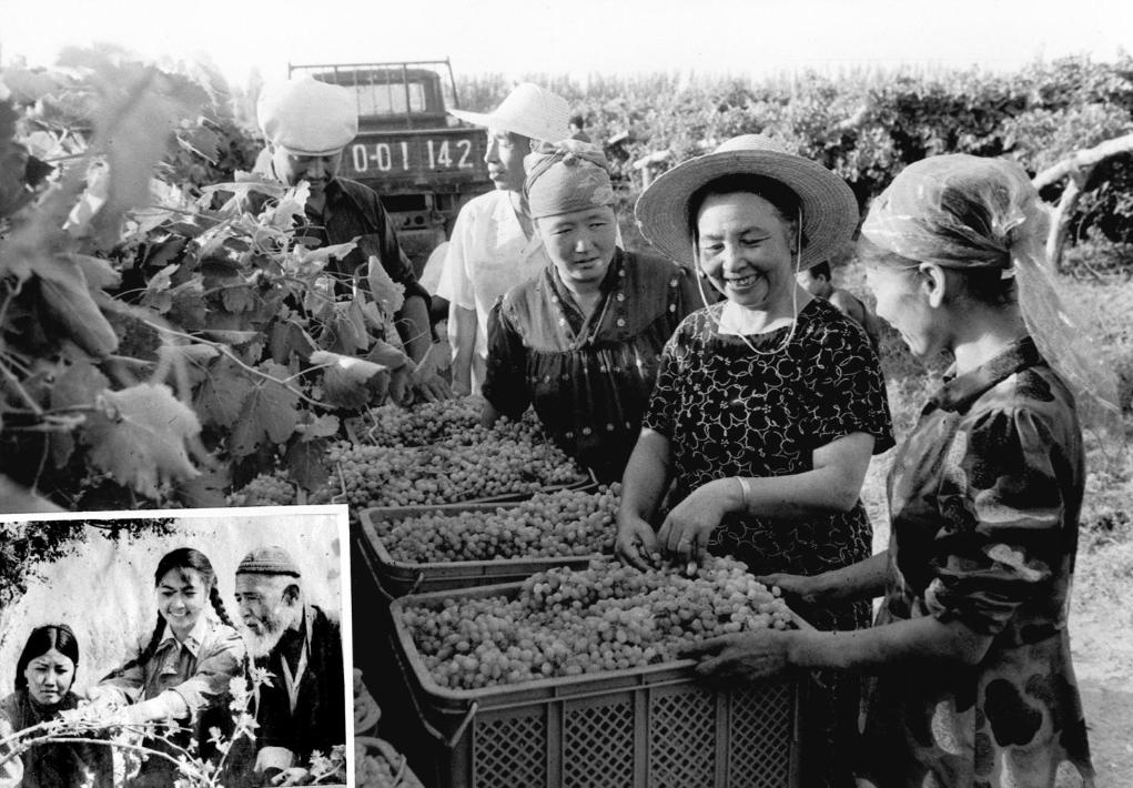 1956年春,我的同事在吐鲁番葡萄沟拍摄了一张新闻照片,反映毕业于华中农学院的汉族姑娘王惠珠指导维吾尔族农民为葡萄剪枝的情景。此后,我每次去吐鲁番,都关注这位“葡萄姑娘”的动向,这一关注就是30多年。1990年,王惠珠已经56岁,她长期留在吐鲁番从事葡萄引种栽培试验,进行瓜果保鲜研究,与当地维吾尔族果农结下了深厚的感情。20世纪50年代,吐鲁番盆地的葡萄种植面积7000亩,平均亩产200多公斤;到1990年,种植面积已达78000亩,平均亩产1050公斤,有的地方高达4000公斤。这些变化中就凝聚着王惠珠半生的心血和汗水。在长期的采访积累中,我用照片记录了从“葡萄姑娘”到“葡萄奶奶”的动人故事。