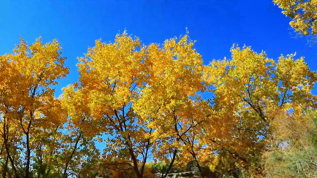 漫步林间,胡杨的树叶在风中轻轻摇曳,仿佛踏入一个如诗如画的金色世界。极目远眺,金色的胡杨与湛蓝的天空交相辉映,构成一幅绝美的秋日画卷。