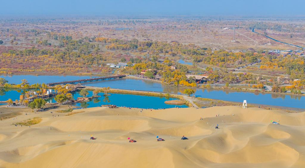 10月18日,游客在新疆巴音郭楞蒙古自治州尉犁县罗布人村寨景区东沙山感受沙漠越野的乐趣(无人机照片)。新华社发(汪志鹏 摄)