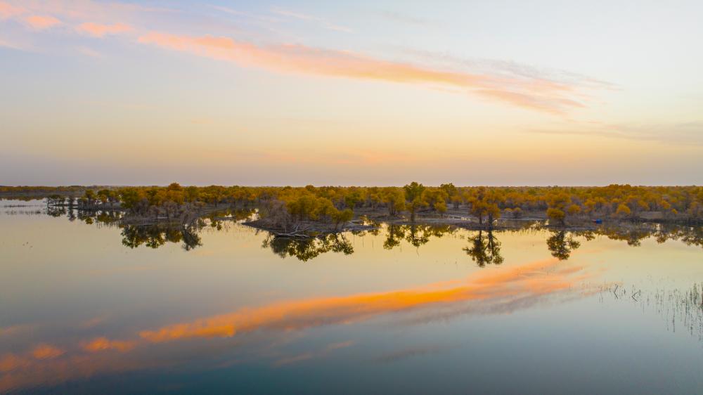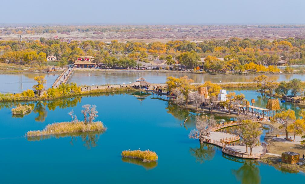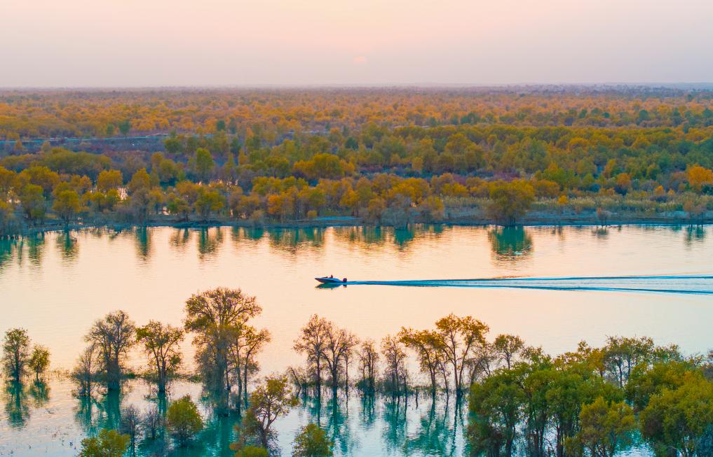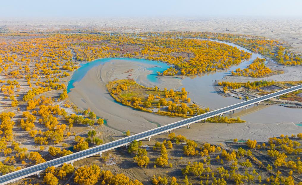 金秋时节,新疆巴音郭楞蒙古自治州尉犁县境内的沙漠胡杨景观与塔里木河互相映衬,美不胜收,吸引不少游客观光游览。