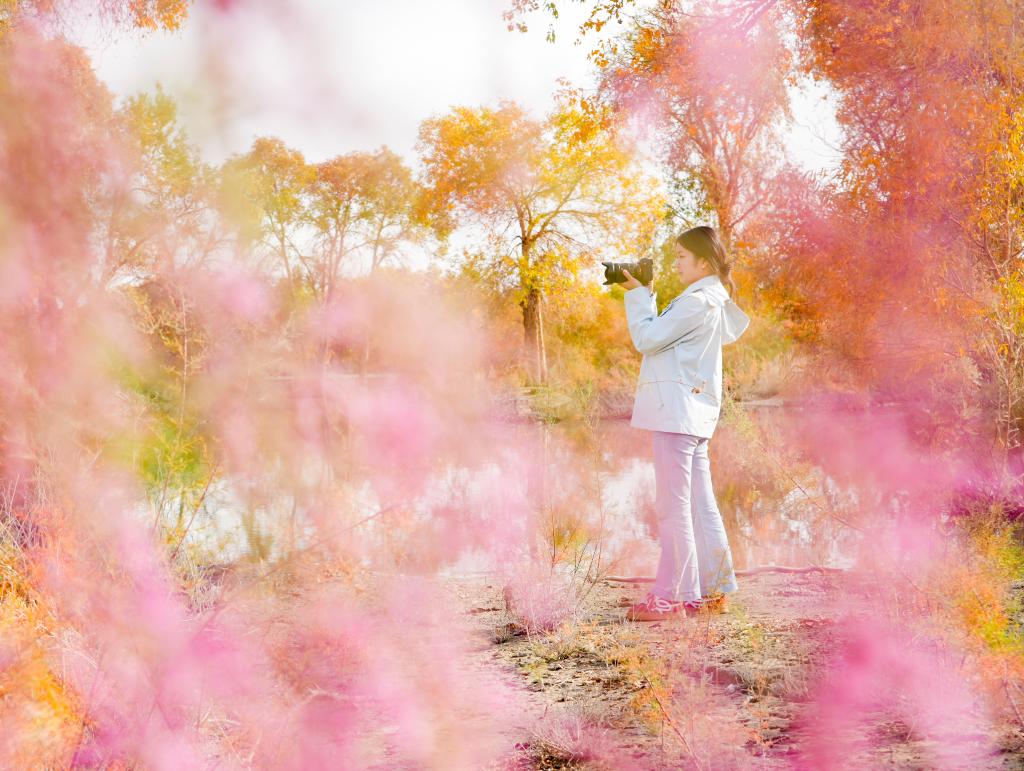 10月13日,游客在新疆巴音郭楞蒙古自治州尉犁县一处胡杨林中拍照打卡。新华社发(汪志鹏 摄)