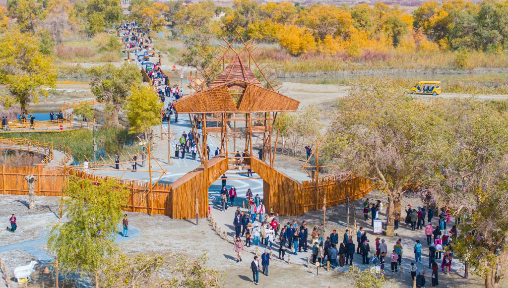 10月18日,新疆巴音郭楞蒙古自治州尉犁县罗布人村寨景区游人如织(无人机照片)。新华社发(汪志鹏 摄)