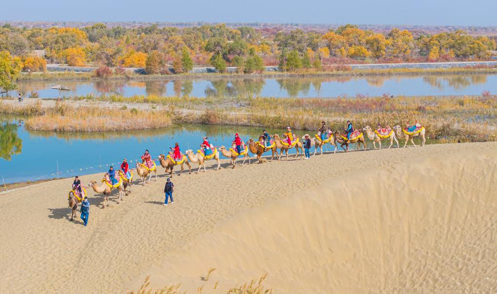 10月18日,游客在新疆巴音郭楞蒙古自治州尉犁县罗布人村寨景区东沙山体验骆驼骑行(无人机照片)。新华社发(汪志鹏 摄)