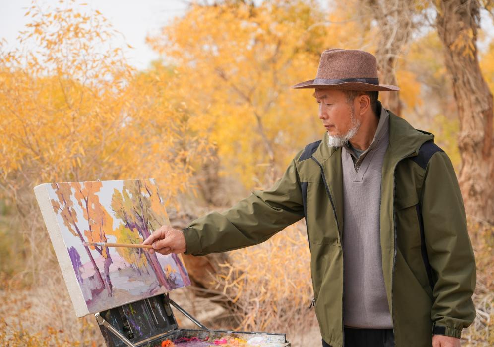 10月13日,绘画爱好者在新疆巴音郭楞蒙古自治州尉犁县一处胡杨林中写生。新华社发(汪志鹏 摄)