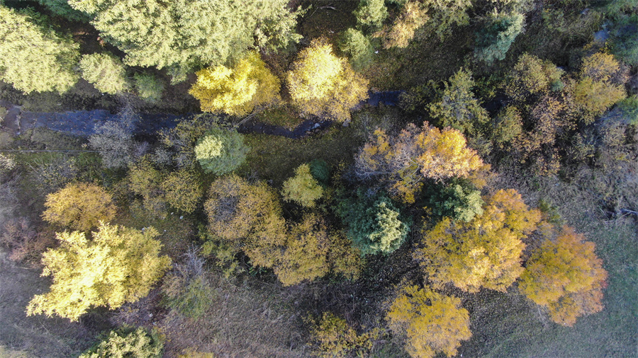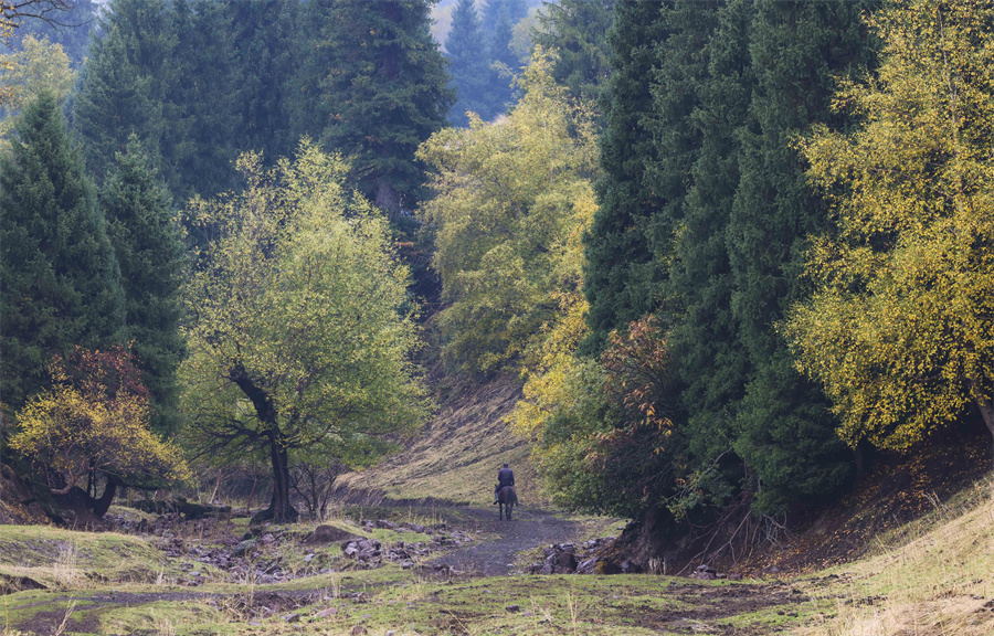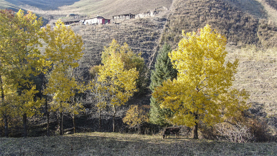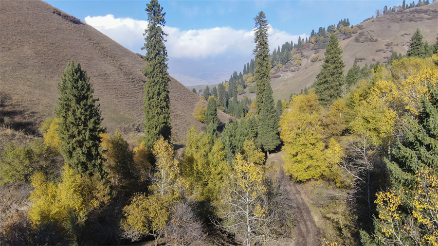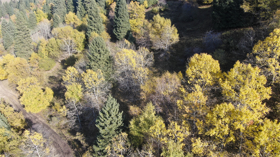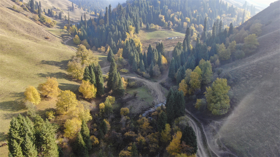深秋时节,大地褪去盛夏的浓绿,那拉提景区却迎来了一年中最绚烂的“色彩季”, 夏日单一的葱郁被秋日丰富的层次所取代。近日,景区内河谷草原、盘龙谷道等峡谷地带的树木已悄然换上“金色外衣”,金黄、橙红、浅褐等色彩交织错落,将山谷装扮得五彩斑斓,与终年翠绿的松树形成鲜明对比、交相呼应,勾勒出一幅壮阔又灵动的秋日画卷。(张文庭 李金维供稿)