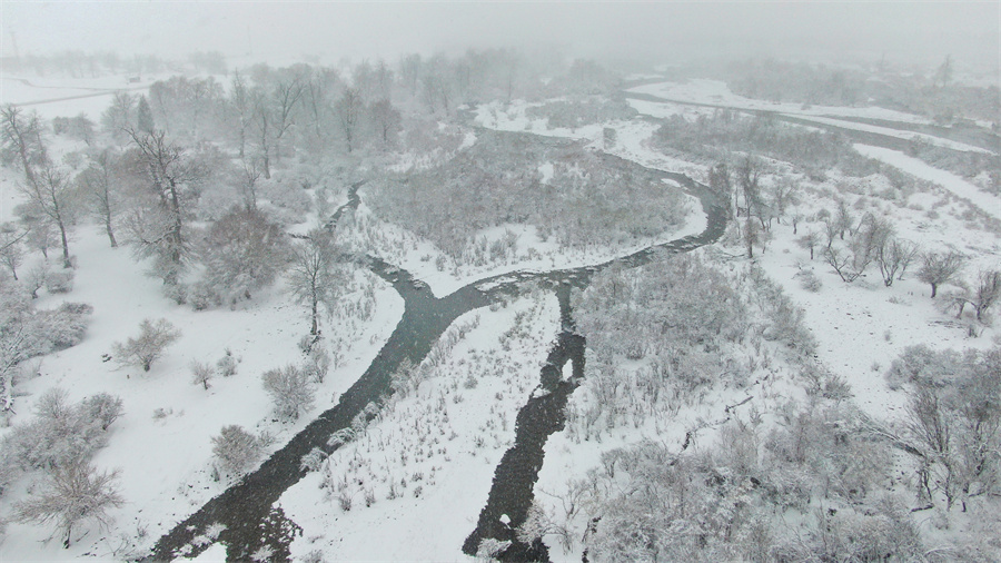河流在雪原中如墨带蜿蜒穿梭,飞鸟静立雪枝,沙棘树的橙红果实缀于琼枝间,与白雪相映。冬雪轻拢万物,将草原的辽阔、森林的深邃、牧群的悠然编织成一幅静谧却不失生机的立冬图景,每一处景致都流淌着“塞外江南”的冬日诗意。