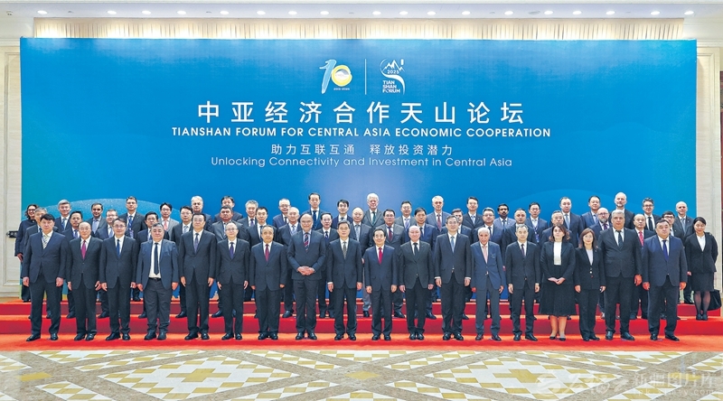 12月2日,中亚经济合作天山论坛在乌鲁木齐举行。这是开幕前,财政部部长蓝佛安,自治区党委书记、兵团党委第一书记、第一政委陈小江与出席论坛的中外嘉宾集体合影。 崔志坚 摄
