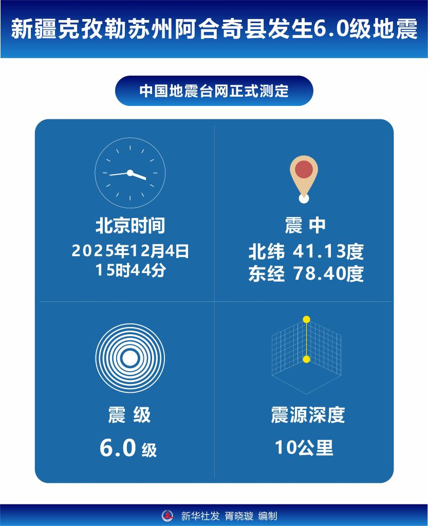 12月4日15时44分,新疆克孜勒苏州阿合奇县(北纬41.13度,东经78.40度)发生6.0级地震,震源深度10公里。