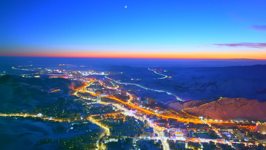 滑雪场灯光亮起,勾勒出雪道的柔和曲线,滑雪者的身影在光影里穿梭,城区的暖光沿着街道铺展,与远处雪山相映,清冷的蓝调中裹着冬季独有的烟火气。