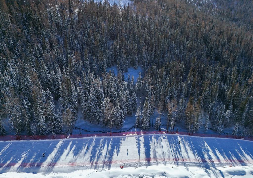 1月17日,滑雪爱好者在新疆阿勒泰可可托海国际滑雪度假区滑雪(无人机照片)。新华社记者 胡虎虎 摄