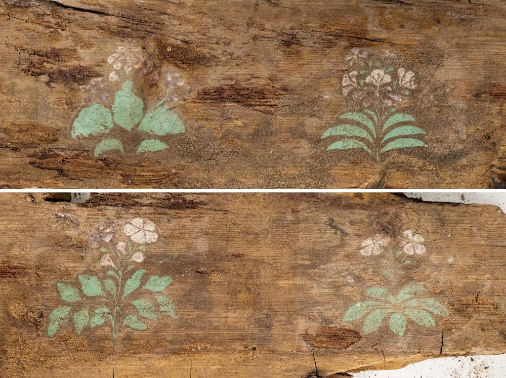 拼版照片:这是在实验室考古方舱内拍摄的墓葬M20出土棺板上的彩绘花卉图案(2月1日摄)。