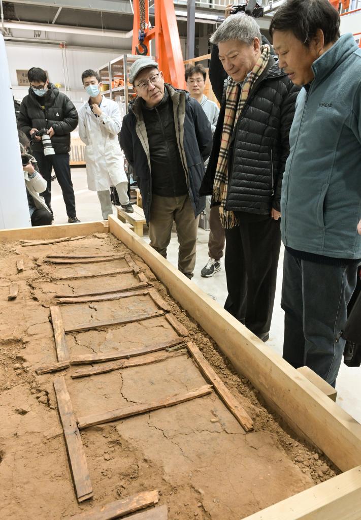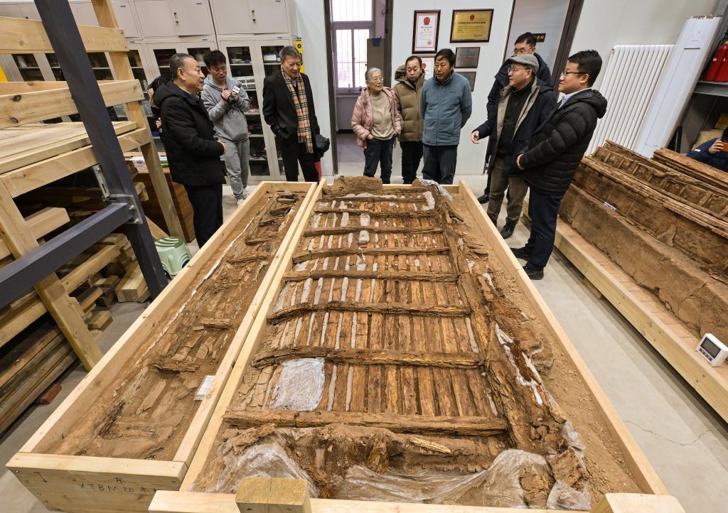专家们在实验室考古方舱内察看墓葬M20出土的完整木榻(2月1日摄)。
