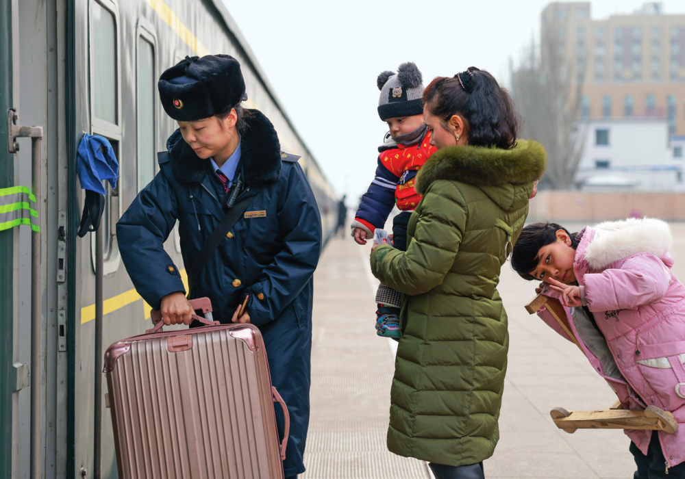 在喀什站站台,列车工作人员帮助旅客将行李搬上7557次列车(2025 年 1 月 2 日摄) 王菲摄 / 本刊