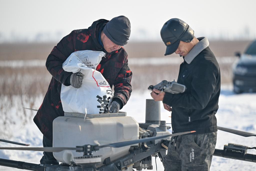 在新疆昌吉回族自治州玛纳斯县乐土驿镇,工作人员将播撒的返青肥料倒入无人机(3月4日摄)。