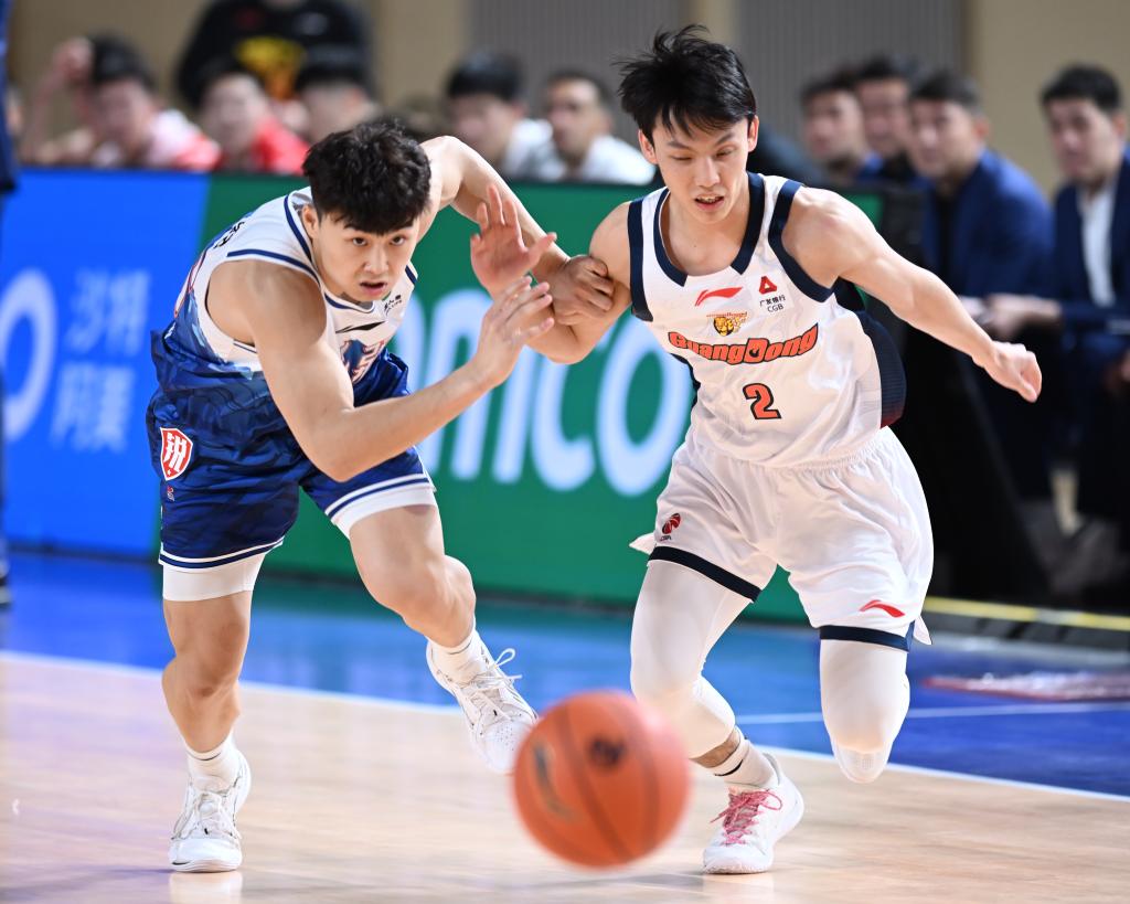 3月11日,新疆伊力特队球员葛浩然(左)与广东东阳光队球员徐杰在比赛中拼抢。新华社发(徐锐摄)