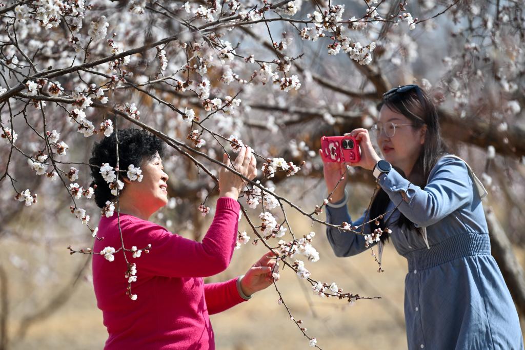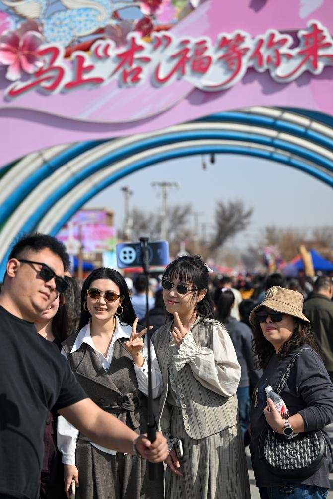 3月20日,在新疆吐鲁番市托克逊县南湖杏花村,游客在杏园打卡拍照。