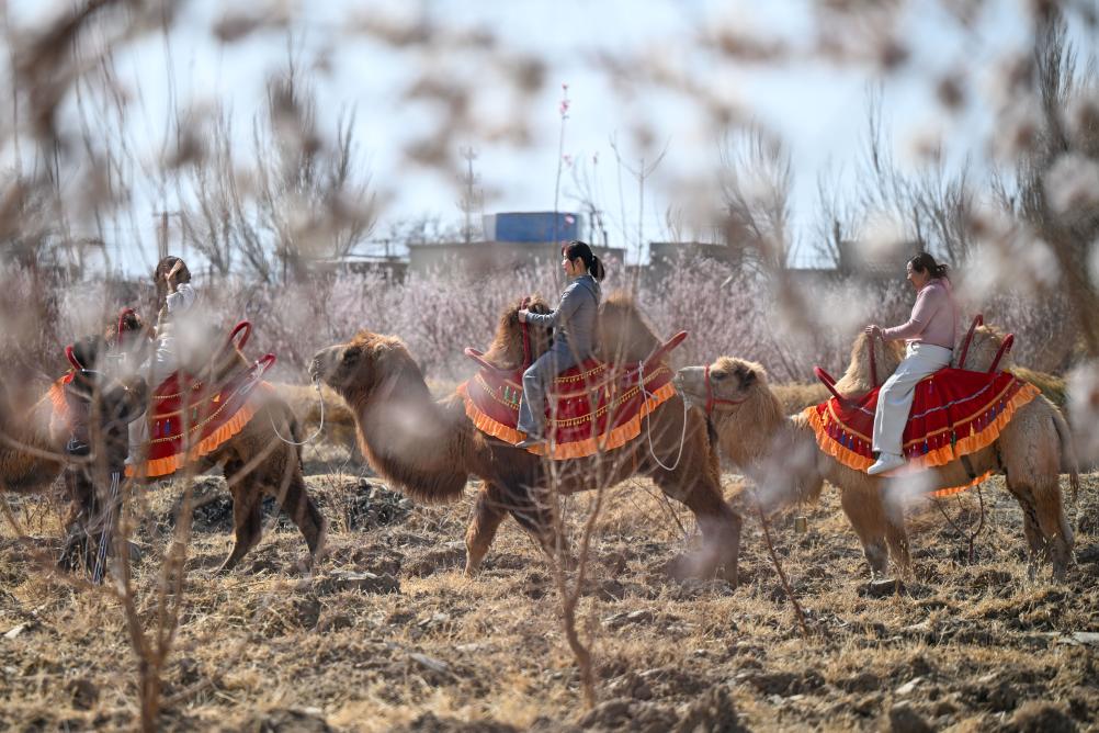 3月20日,在新疆吐鲁番市托克逊县南湖杏花村,游客骑骆驼赏杏花。