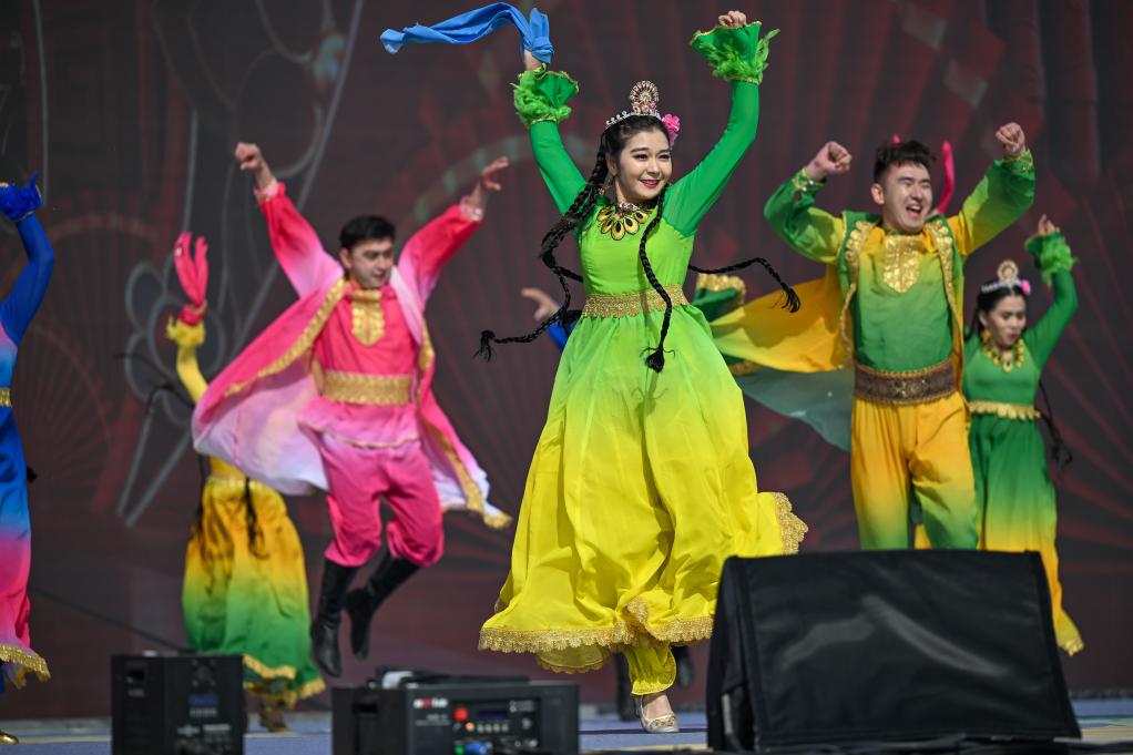 3月20日,在新疆吐鲁番市托克逊县南湖杏花村,演员为游客和当地居民表演舞蹈。