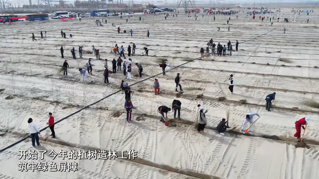 植树现场,大家挥锹挖坑、扶正苗株、细心填土、踩实浇水,一株株新苗迎风挺立,为戈壁沙漠增添勃勃生机。