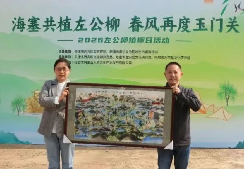 活动现场,两地互赠文化礼品。哈密市委宣传部赠送左宗棠文化书籍、天地正气塔模型,西青区回赠杨柳青年画《新疆全图》(复制品),以文化信物架起沟通桥梁。