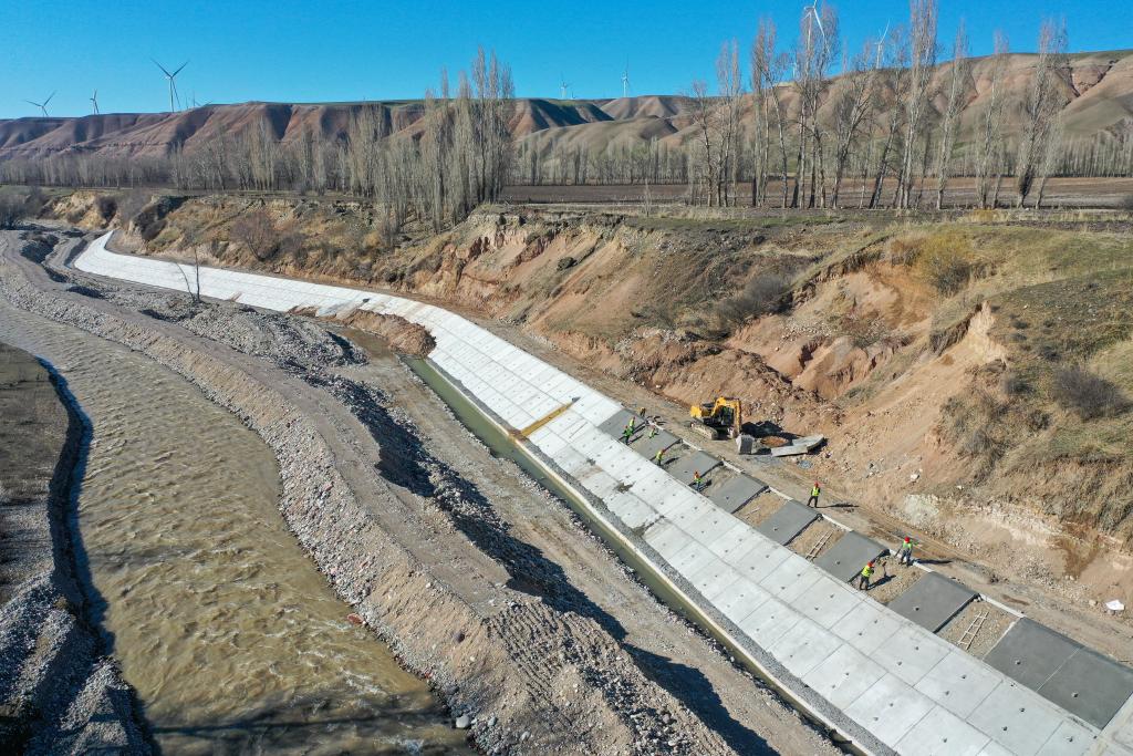 施工人员在新疆伊犁哈萨克自治州新源县修建大吉尔格朗河护岸(无人机照片,3月27日摄)。新华社记者 丁磊 摄