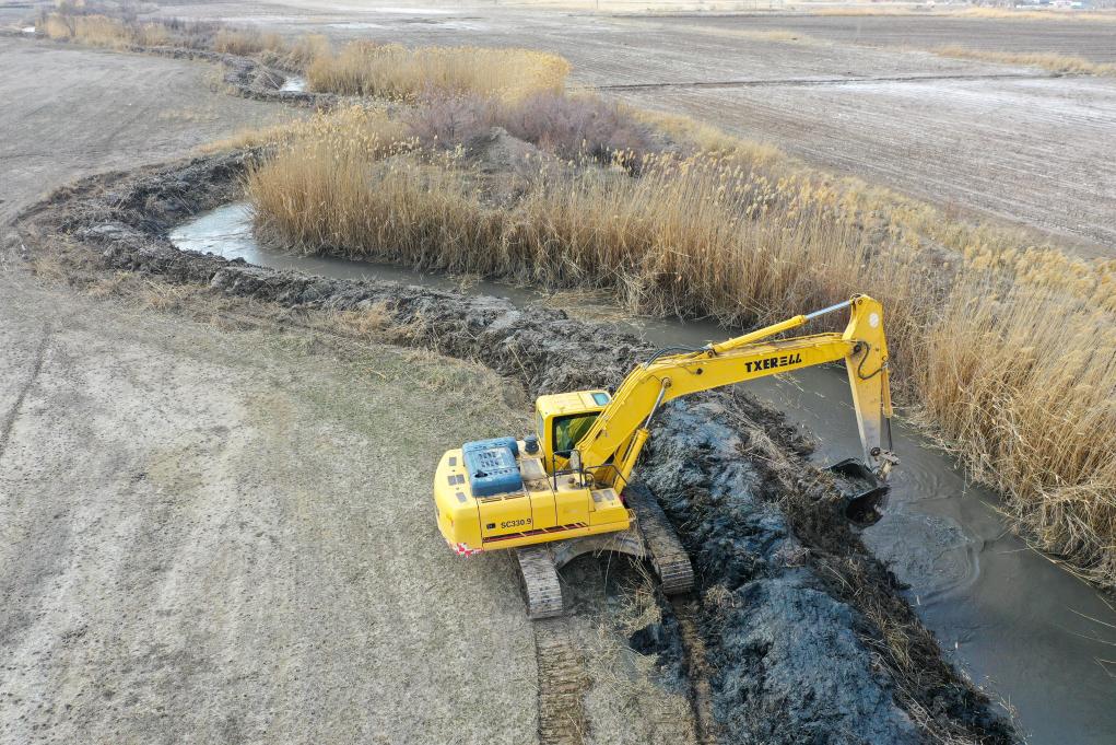 工作人员驾驶挖掘机在新疆伊犁哈萨克自治州察布查尔锡伯自治县堆齐牛录乡进行清淤作业(无人机照片,3月24日摄)。新华社记者 丁磊 摄