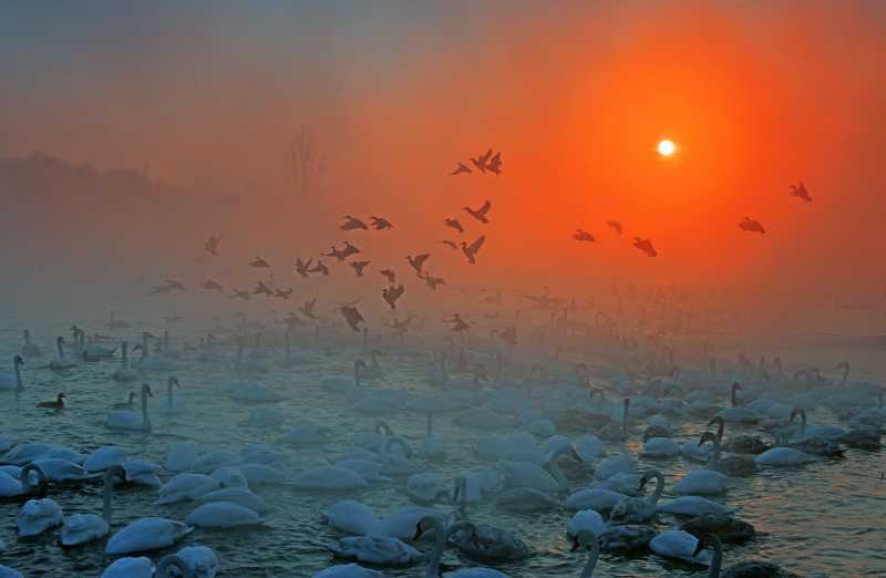 新疆伊宁:天鹅翩跹绘冬日画卷